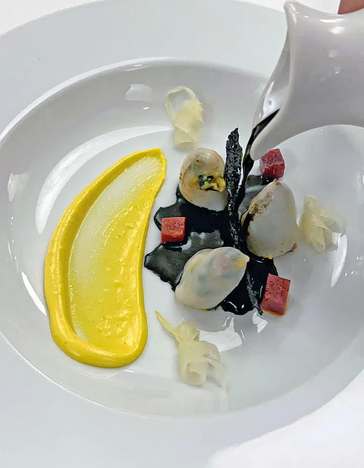 In a carefully choreographed move, four artistic plates of delicate encornets farcis are placed on our table at the same time. The head waiter describes the dish — tender baby squid stuffed with spinach and chorizo, and finished with a dramatic inky squid sauce — with such verve, I can almost taste it even before taking a bite.