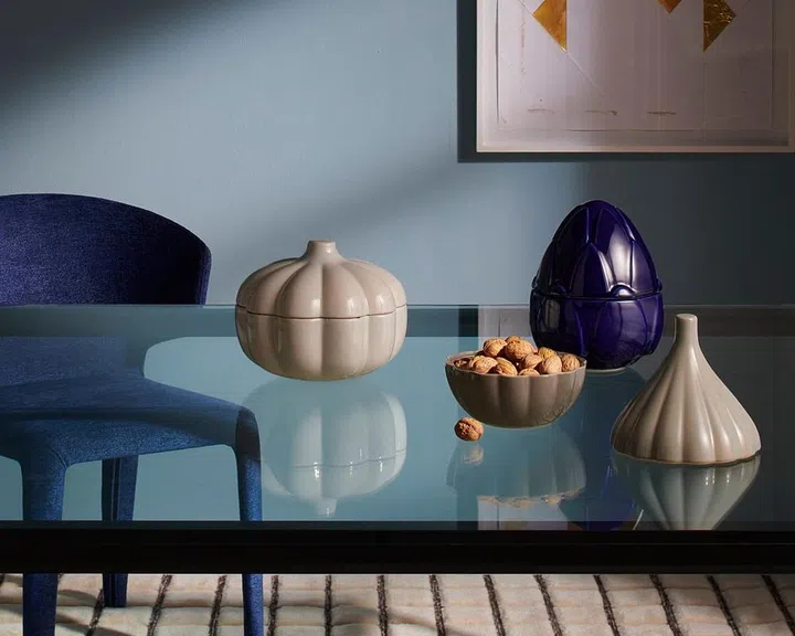 Also in the Details Collection are the Taac and Torrecotta accessories designed in collaboration with renowned Italian chef Davide Oldani. Drawing inspiration from the culinary world, the Taac range features enamelled ceramic containers – shaped like a pumpkin, an onion, an asparagus and a chicken – are both functional and decorative. These pieces offer a quirky yet elegant touch to any room, while infusing a sense of fun and creativity with their playful designs.