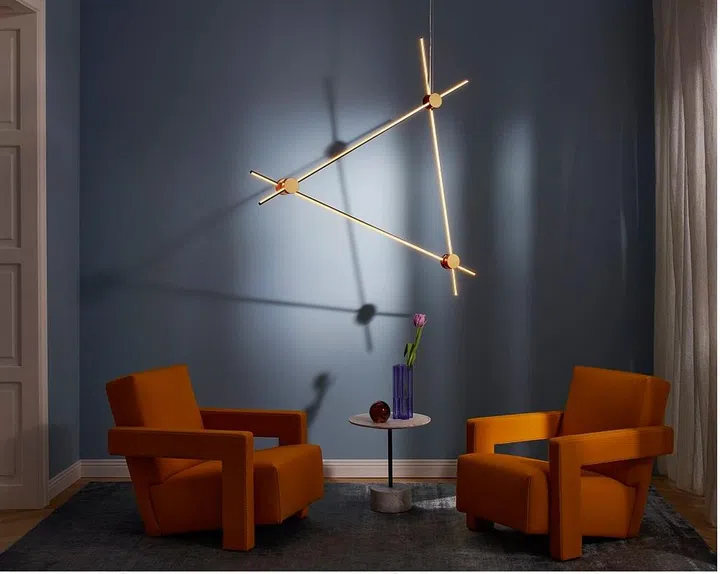 Consider a versatile lighting solution such as the EITIE Lighting System by Tobia Scarpa. This distinctive and versatile piece can transform into a wall, pendant, table or floor lamp depending on your needs. It features bars of light connected by circular black metal joints, allowing you to adjust lighting angles and effects to create your desired mood.