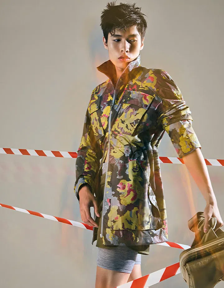 A print designed by the late British artist Duncan Grant is given stylish new life on an oversized safari jacket with a reflective finish.