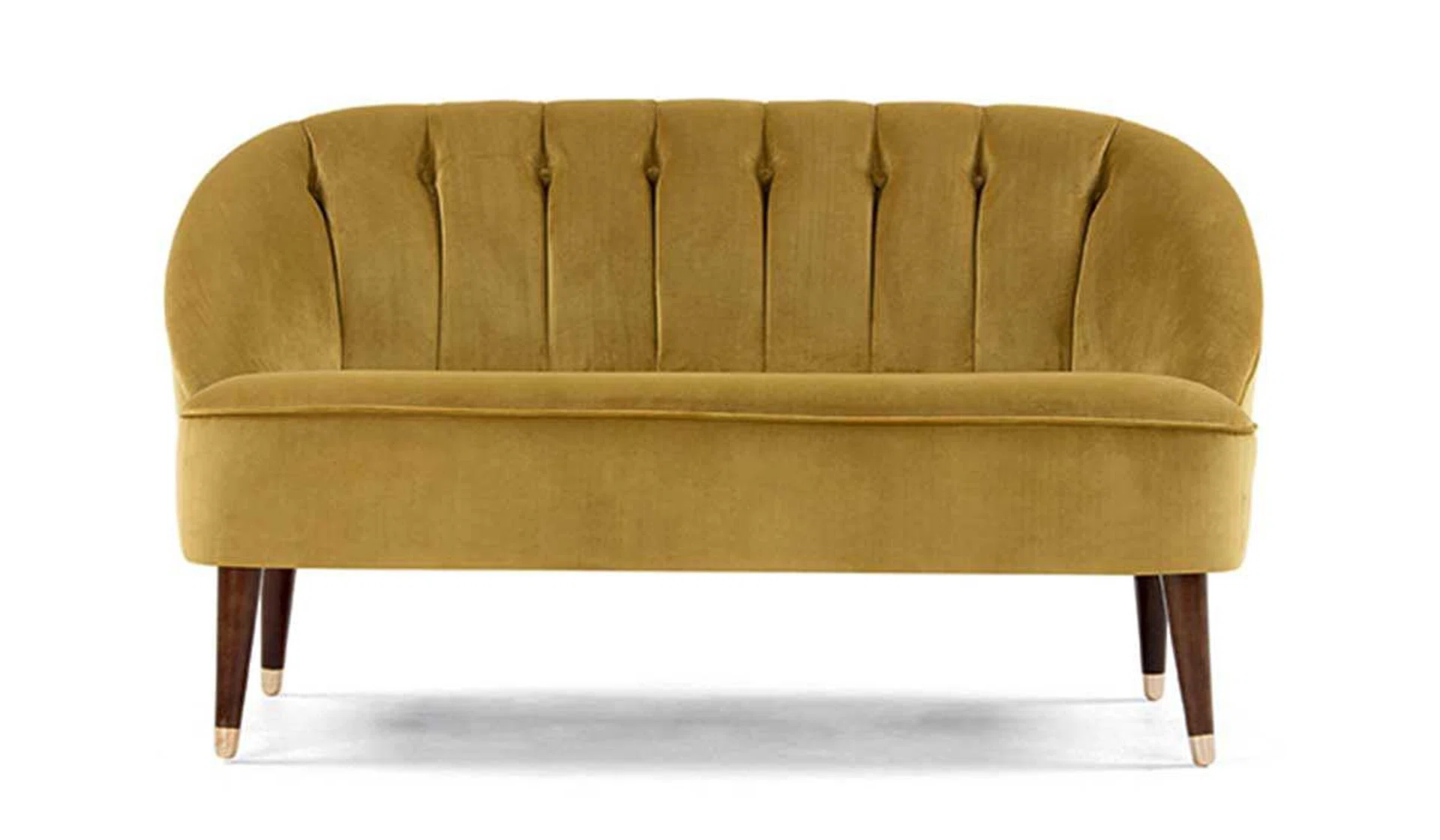 Over at Made.com, "Margot" is a stylish couch upholstered in smooth velvet, with a buttoned backrest and dark wood legs finished with brass caps.