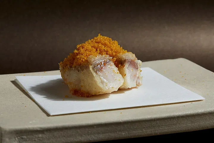 One of the tempura items that Tentsuru serves is the Nodoguro (blackthroat sea perch) fillet from Kyoto partnered with homemade karasumi (salted mullet roe) shavings. Other fatty fish lightly coated with tempura batter and fried include the white-fleshed kinmedai from Chiba, and silver skinned Tachiuo from Tokyo.
