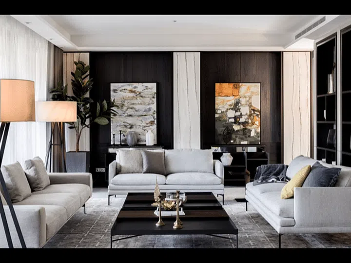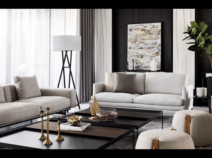 The client selected two sets of sofa designs, both with but clean lines and mid-back from furniture brand Lema (available at W.Atelier) to help add further interest in the visual play of the space. A pair of black oak “Cala” floor lamps by Joan Gasper was selected to help to anchor the positioning of the main sofa set behind the glass door.