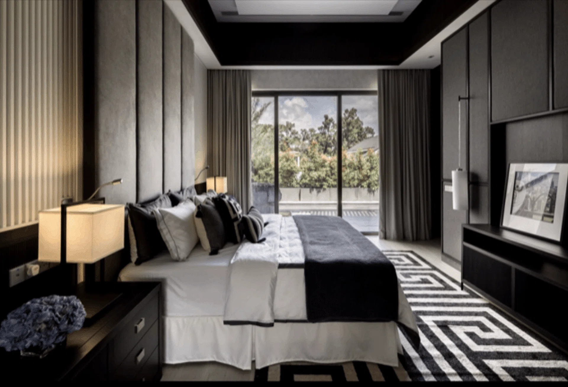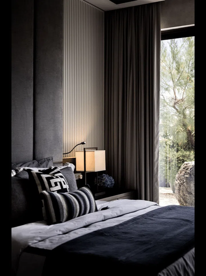 The master bedroom looks out onto a terrace with a Japanese Zen garden designed by Renowned Zen Buddhist landscape master Sunmyo Masuno. The client requested that the design of the master bedroom reflect the garden outside, so the design team decided to keep the design elements basic with the use of soft lighting and simple lines.