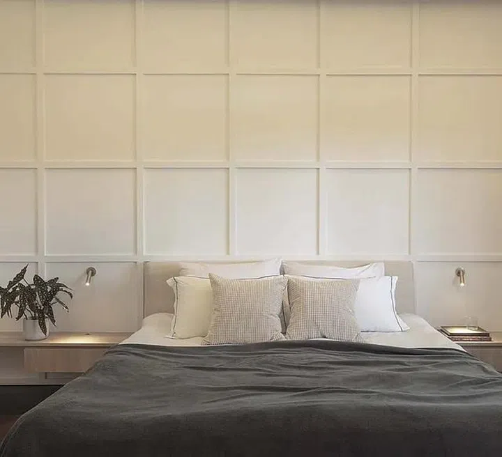A timber frame around the solitary window in the master bedroom draws the eye out to the communal garden beyond, heightening the connection between the room and the outdoors. As the original parquet flooring had an orange undertone, it had a busy look, so it was stained a darker brown to convey a quiet feeling.
