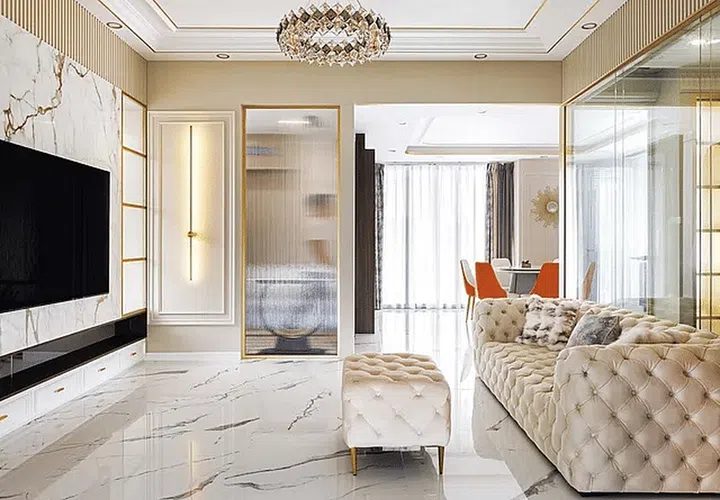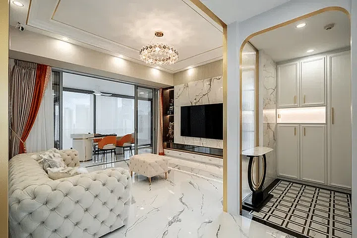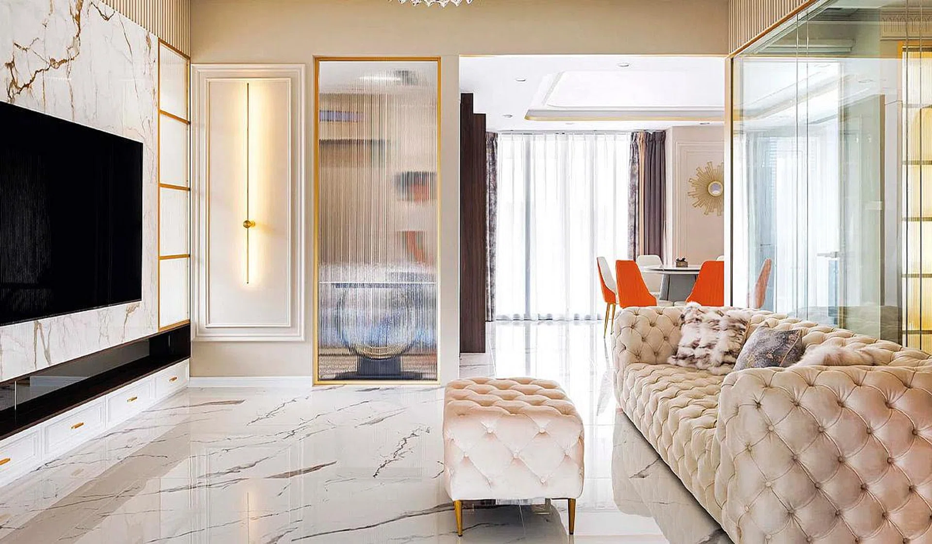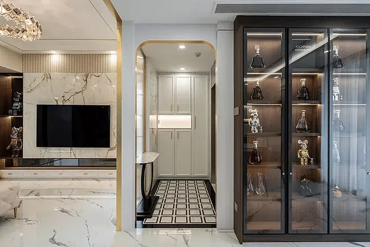 These can be found on the feature wall, the living room floor, and the bathrooms. Meanwhile, gold trimmings dotted throughout amp up the glamour and elegance of the home.