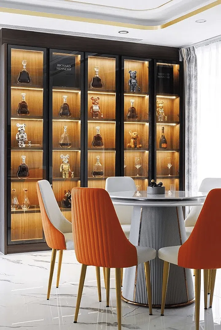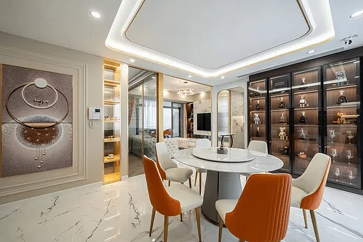 The dining chairs add a much-needed pop of colour without detracting from the elegance of the space.