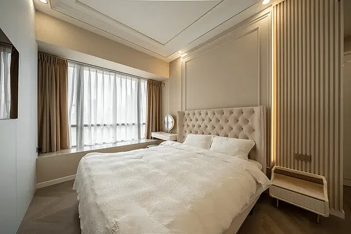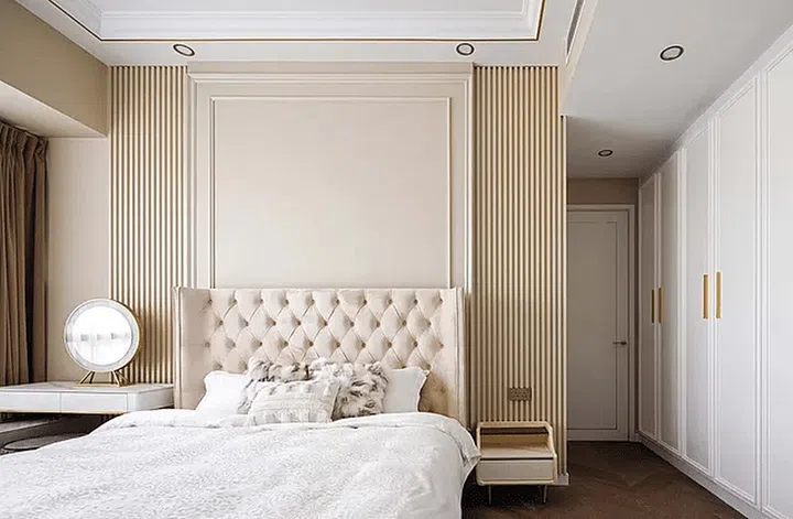 The tufted headboard in the master bedroom was a smart choice as it imbues a touch of old-world glamour into the sleeping zone.