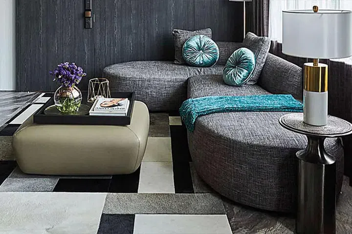 The tapestry cowhide rugs were made in Thailand, while the curvy sofa and armchair were fabricated locally.