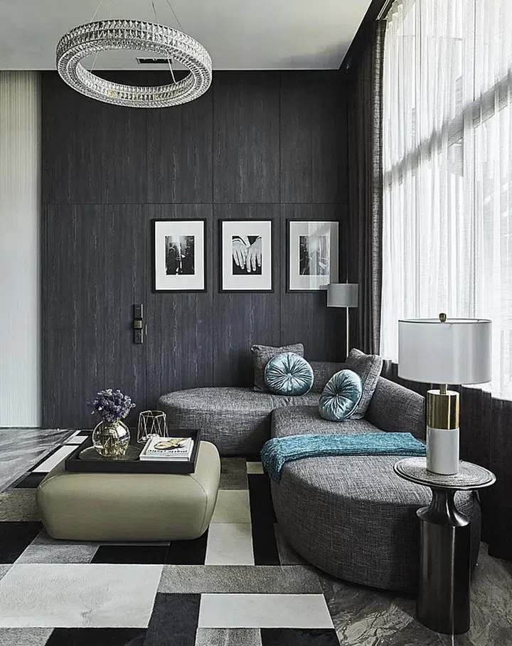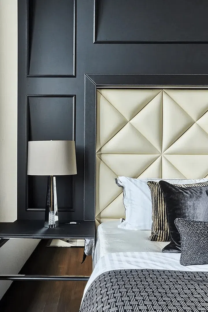 The master bedroom features a wealth of textures. Adrian fills out the tall ceiling with a black chandelier and an equally tall bed headboard finished in white leather with a geometric pattern and black leather trim.