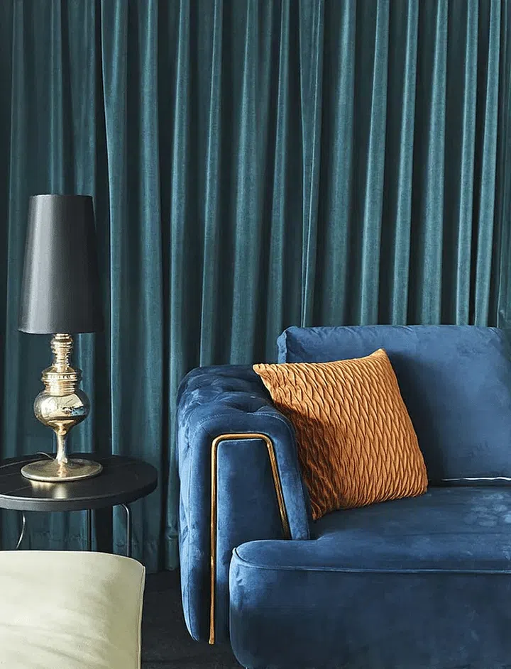 The sheer layer features a solid fabric trim on its bottom, up to the sofa’s height, so when the layer is closed, the view is framed nicely by the sheer upper part.