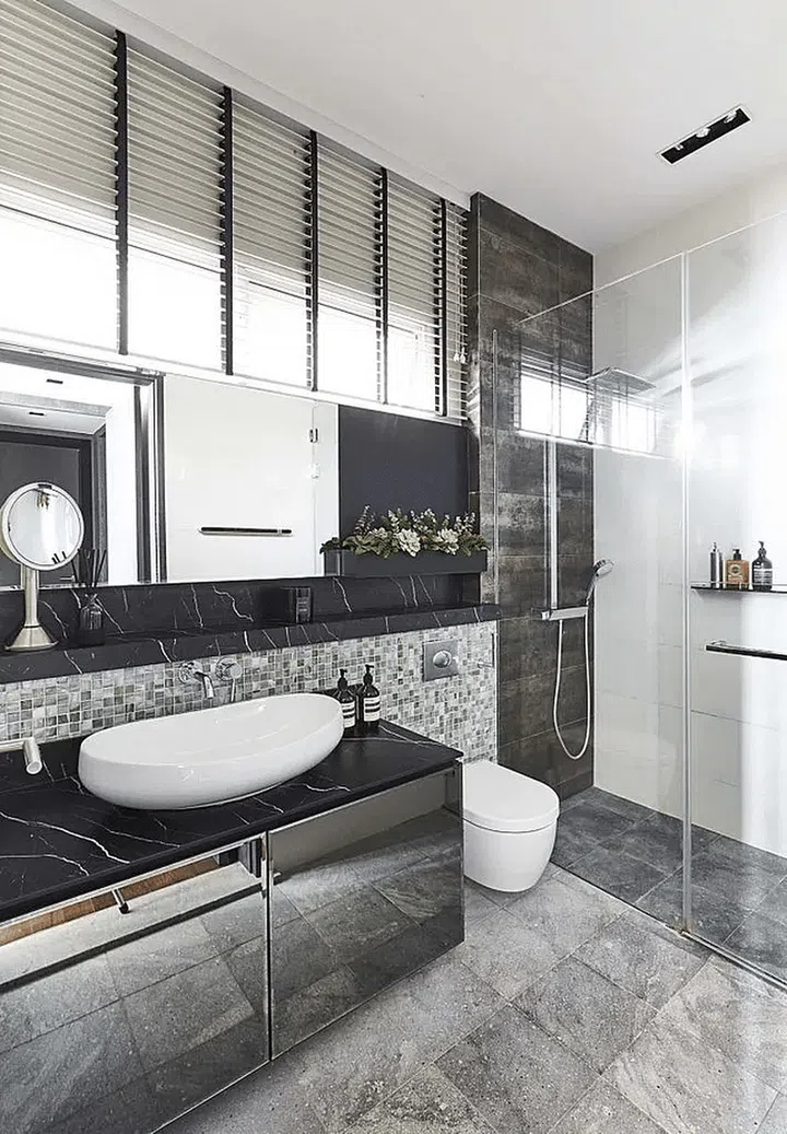 The striking master bathroom features marble- look tiles and artificial plants to lend a biophilic touch.