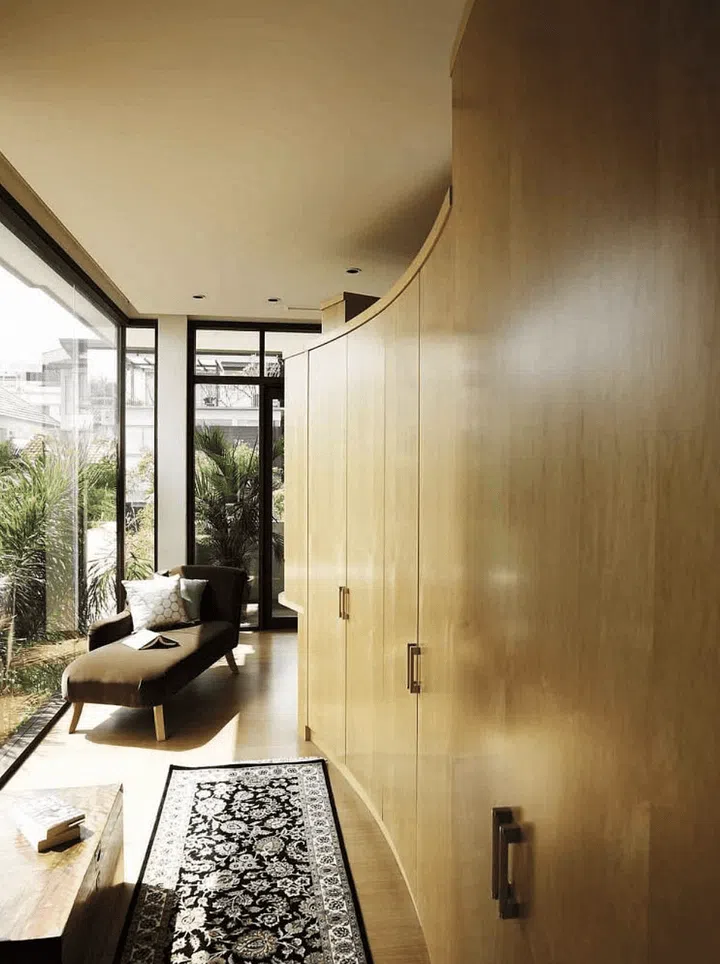 A chaise longue at at one corner of the sculptural wardrobe “island” looks out to the greenery, providing a little “escape” corner for reading.
