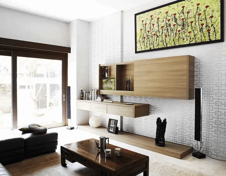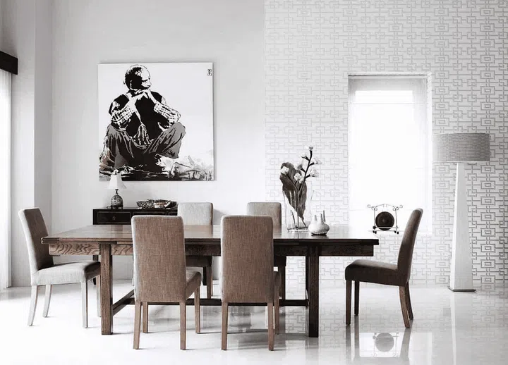 The home owner matched the colours and the mood of her collection of artworks to the furniture in each room. For instance, in the dining room, a monochromatic portrait of a man gazes pensively towards the monochrome Oriental-motif wallpaper.