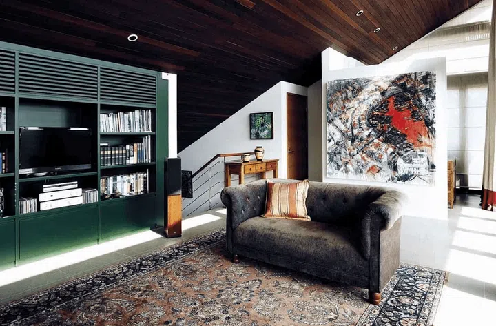 The top floor – which is considered half a storey – has a moodier ambience due to the dark brown timber of the ceiling. Dark green bookshelves also contribute to the cosy look of the space.