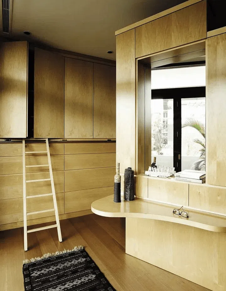 The statement walk-in wardrobe features curved details that add visual interest to the all-wood look.