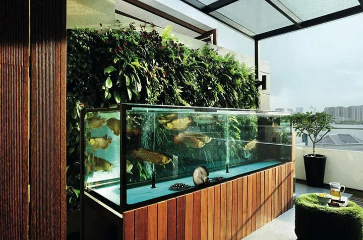 The husband shows off his collection of exotic fish in a massive tank in the open terrace on the second floor.