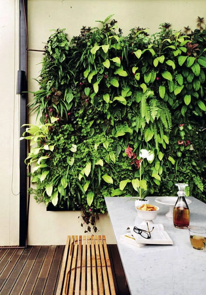 The spacious balcony that leads out from the living area is dominated by a huge vertical garden and a planter box of greenery.