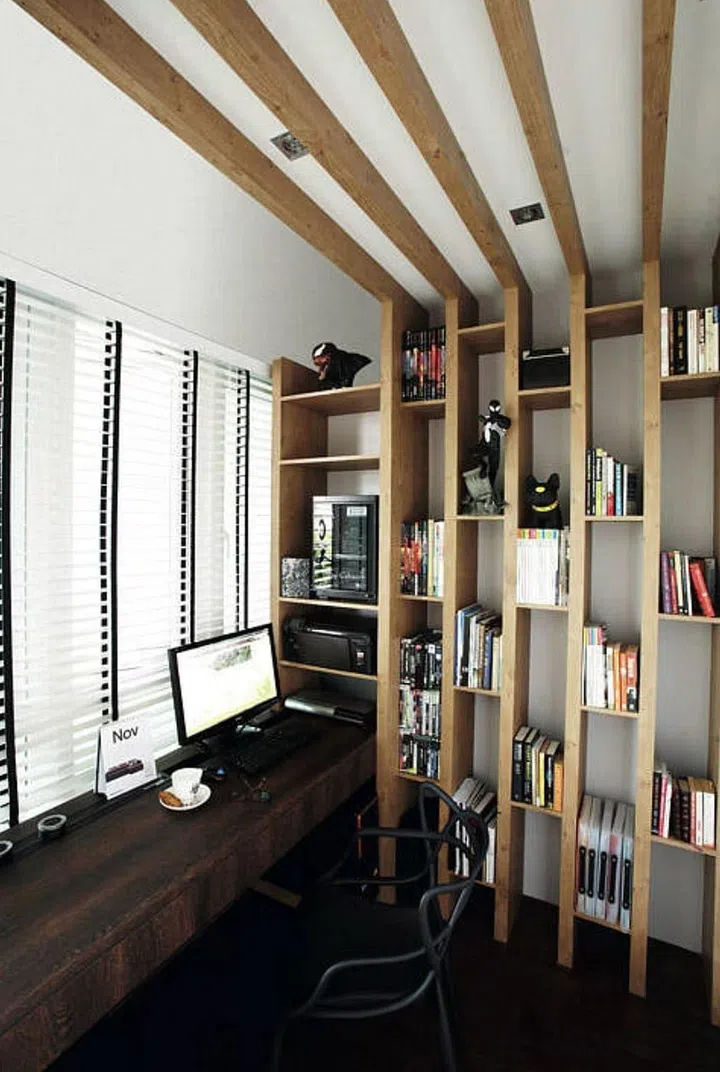 In the study, the designers customised a unique bookshelf with staggered shelving heights to display their book collection.