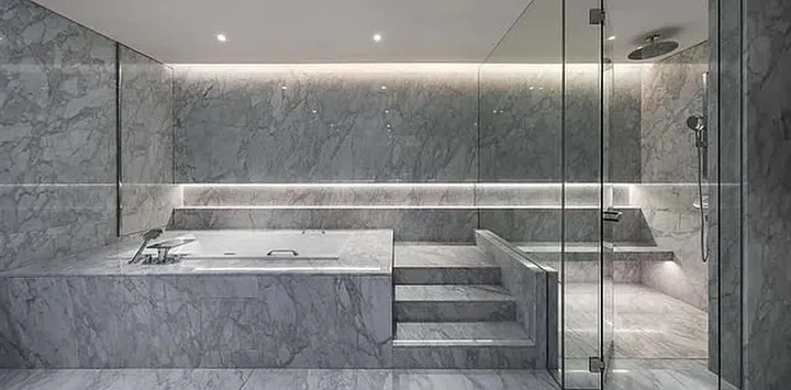 The master suite consists of a sleeping area, a walk-in wardrobe, a spacious sitting area and a palatial bathroom featuring a book-matched, cross-cut Carrara marble floor and wall.