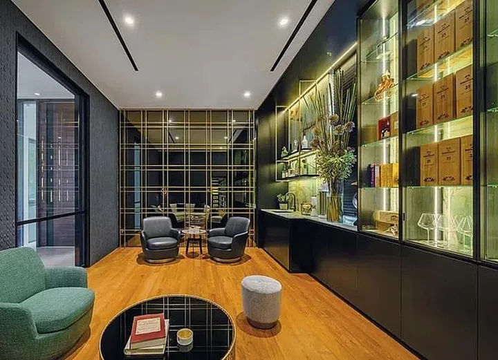 The adjacent wine-tasting room is an intimate space with a cosy lounge setting conducive to enjoying and appreciating wines. The main attraction is the Tiffany Quartz marble backdrop with its turquoise hue and dramatic veins. The dark veneer finish on the built-in shelves and cabinets is carried over from the wine cellar, reinforcing the connection between the two spaces.