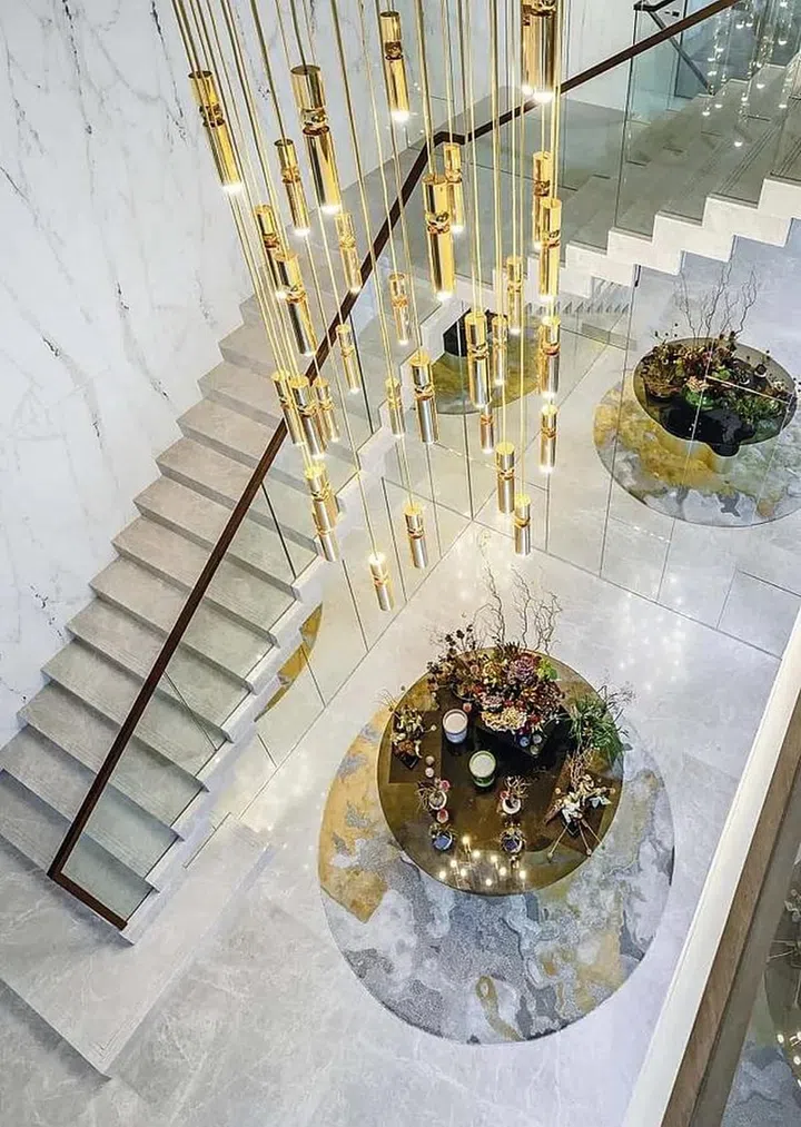 An imposing staircase ascending alongside a book-matched Colorado Gold marble feature wall makes for a grand welcome gesture at the entrance foyer. Mirrored panels add another dimension to the space, while also visually moderating the monolithic design of the staircase. Taking the grandeur to new heights, a bespoke Lee Broom Fulcrum chandelier accentuates the high ceiling.