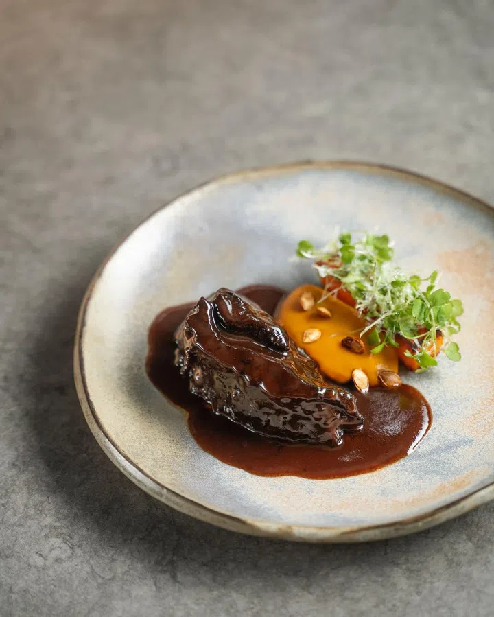 Grass-fed Australian beef cheek, butternut squash, baby arugula at Esquina
