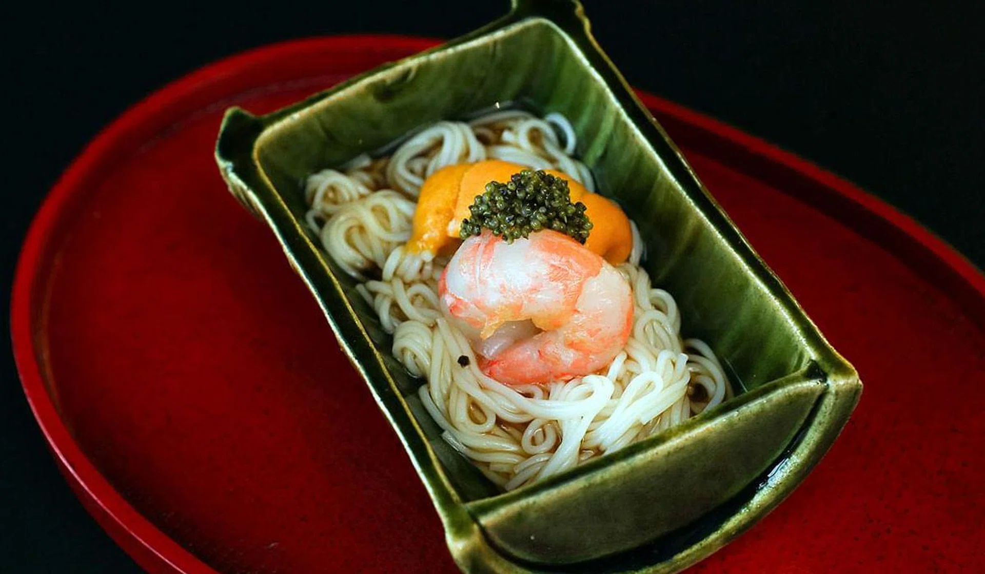 Her signature cold prawn somen well deserves praise as her take on Hokkien prawn noodle soup. Cold somen stays resilient and chewy in a cold prawn broth that's both light and intense, while chilled cooked botan ebi, uni and vegetable 'caviar' or tonburi complete the transition. We would love to see what she can do with bak kut teh.