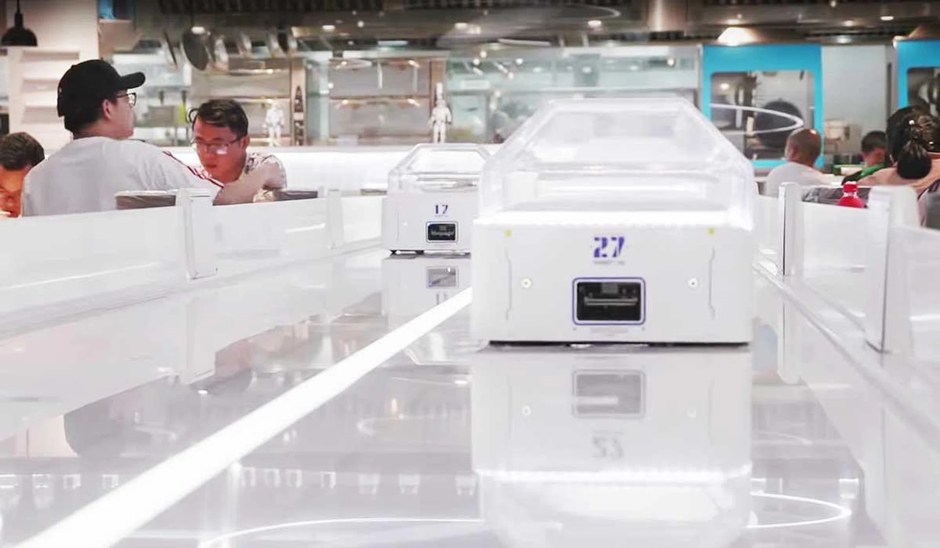 Raising efficiency and lowering labour costs are the objectives at Alibaba's "Robot.He" diners, where waiters have been replaced by robots about the size of microwave ovens, which roll around the dining room on table-high runways.
