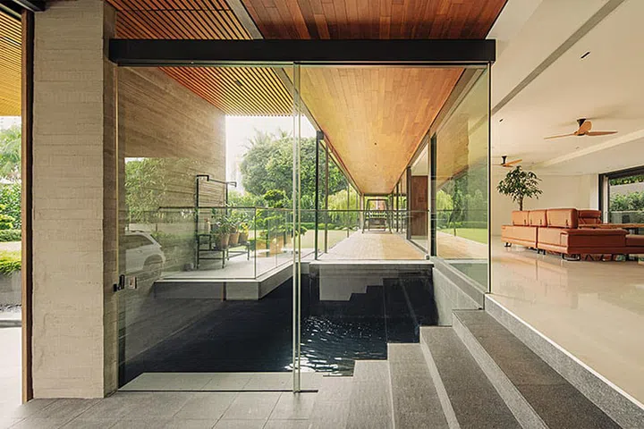 As Liu points out, the roof of the porch is the underside of a single volume or “box” that rises above the entrance. For continuity and to give the architecture texture, it is also entirely covered in teak.