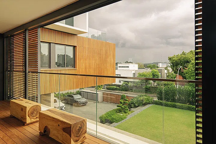 On the second floor, both volumes facing the road feature sliding doors with louvred teak strips, ensuring the perfect balance of privacy, light and airflow.