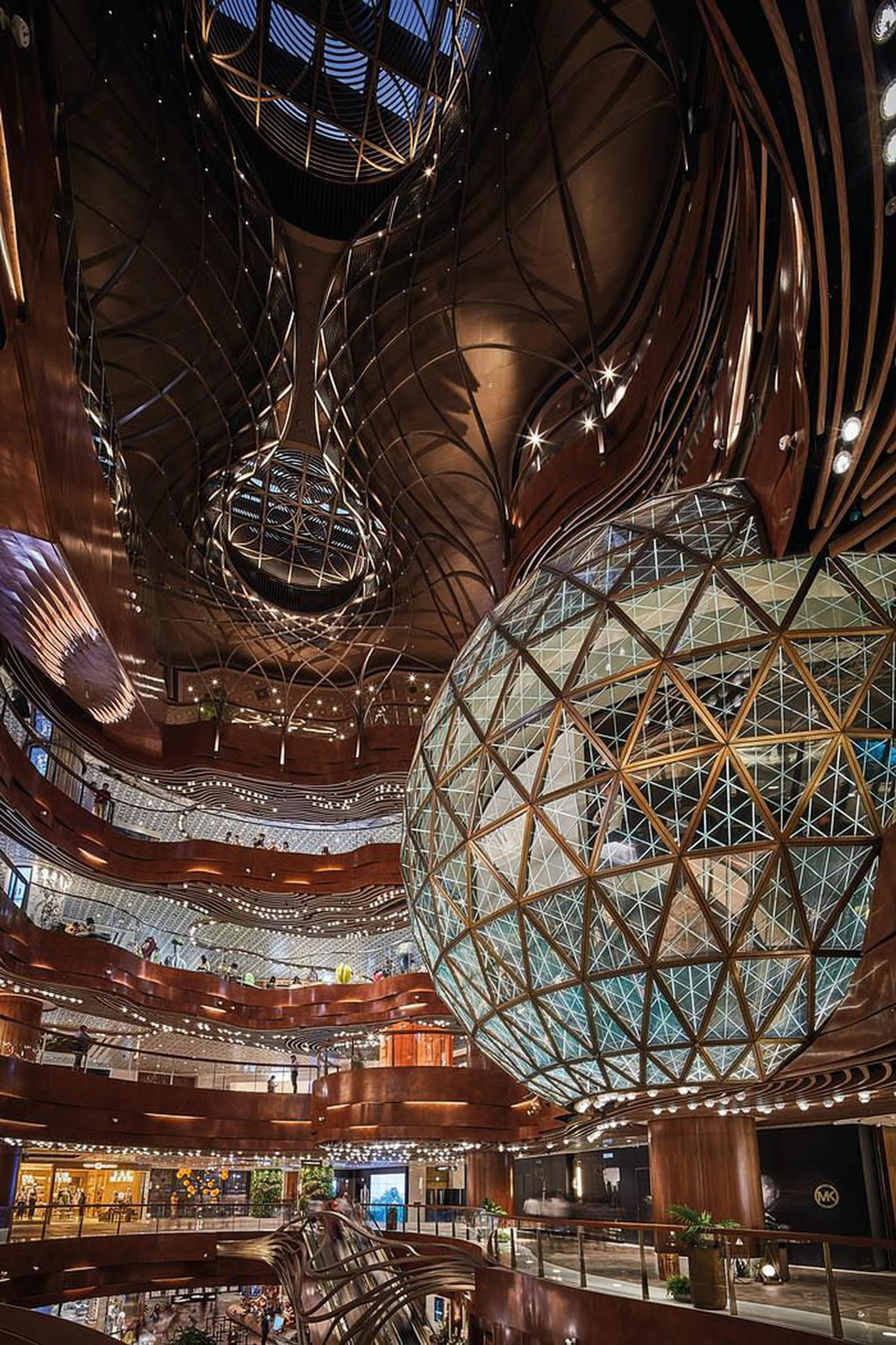 The grand atrium evokes the dizzying sensation of a galaxy whirling with stars. The Gold Ball, visually reminiscent of a planet with its latticework of V-cut glass panels, houses a creative space for exhibitions and pop-ups. The Escalating Climbers by Hong Kong design firm LAAB are wrought out of steel and add a sculptural, organic element to the space. Lighting it all are 1,800 glass bulbs designed by UK lighting firm Speirs & Major to pulse and glow in different patterns throughout the day, mimicking the spontaneous sparkle of real stars.