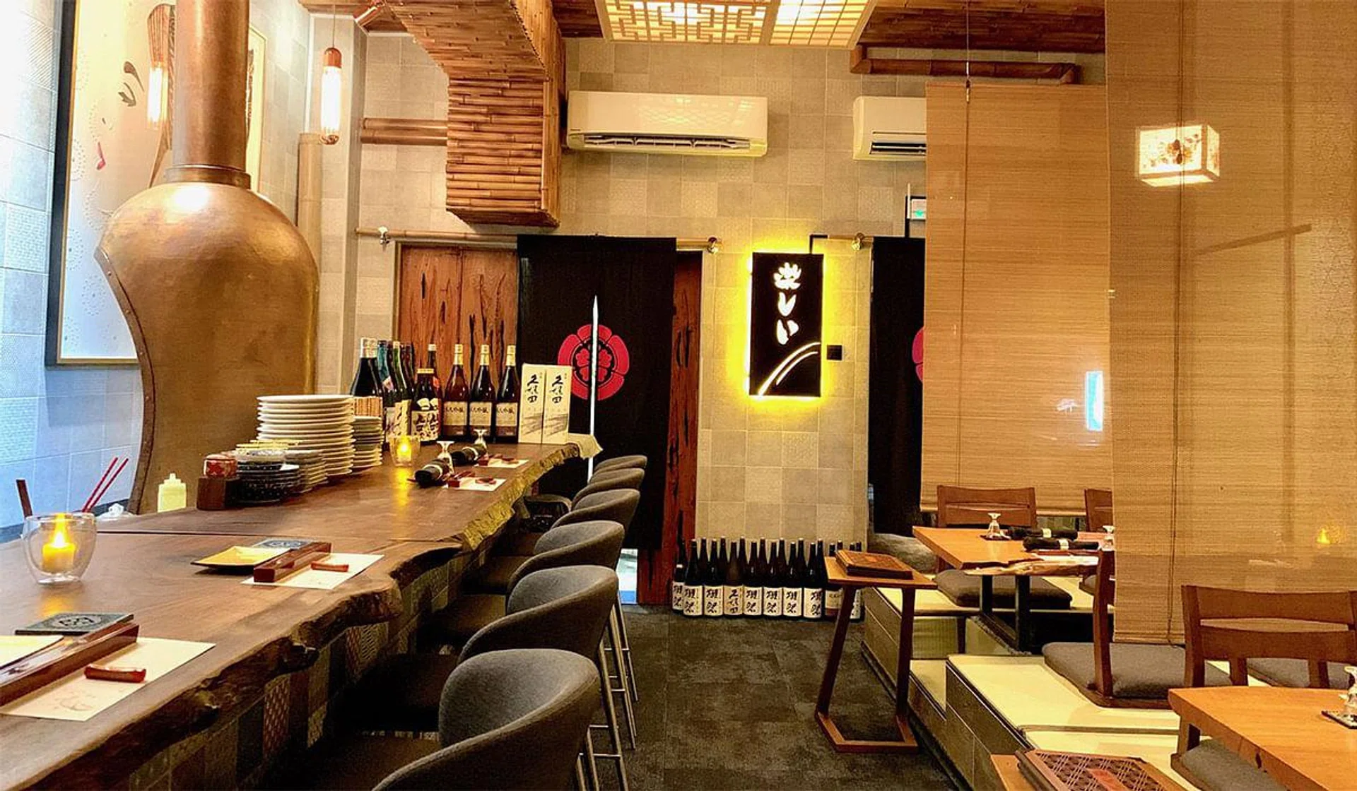 It's not fair, you get to wear slippers, we complain inwardly as we pad after the server into a long dining hall that's half counter and half horigotatsu-style recessed table seating. The solid wood counter and tables cut from original tree trunks with uneven edges intact prove that this is no budget set up, although its definition of style seems derived from a culture different from ours.