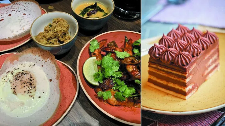 From above: Chef Naleendra's hoppers are soulmates with the creamy dhal, the egg version has the added luxury of a soft runny yolk, Isso Devil prawns; typical Sri Lankan chocolate biscuit pudding.