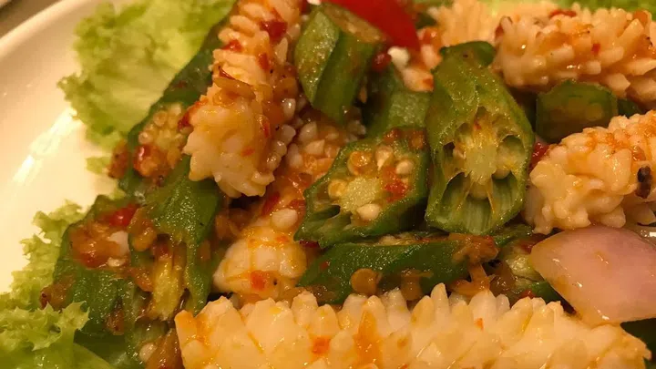 In case you need more energy to think such thoughts, add a plate of squid stir-fried with chinchalok (fermented tiny shrimps) and lady's finger or okra (S$18) - lovely curls of just-cooked squid scored with cross-hatch pattern and tossed in a spicy, briny sauce thickened with slippery chunks of the okra.