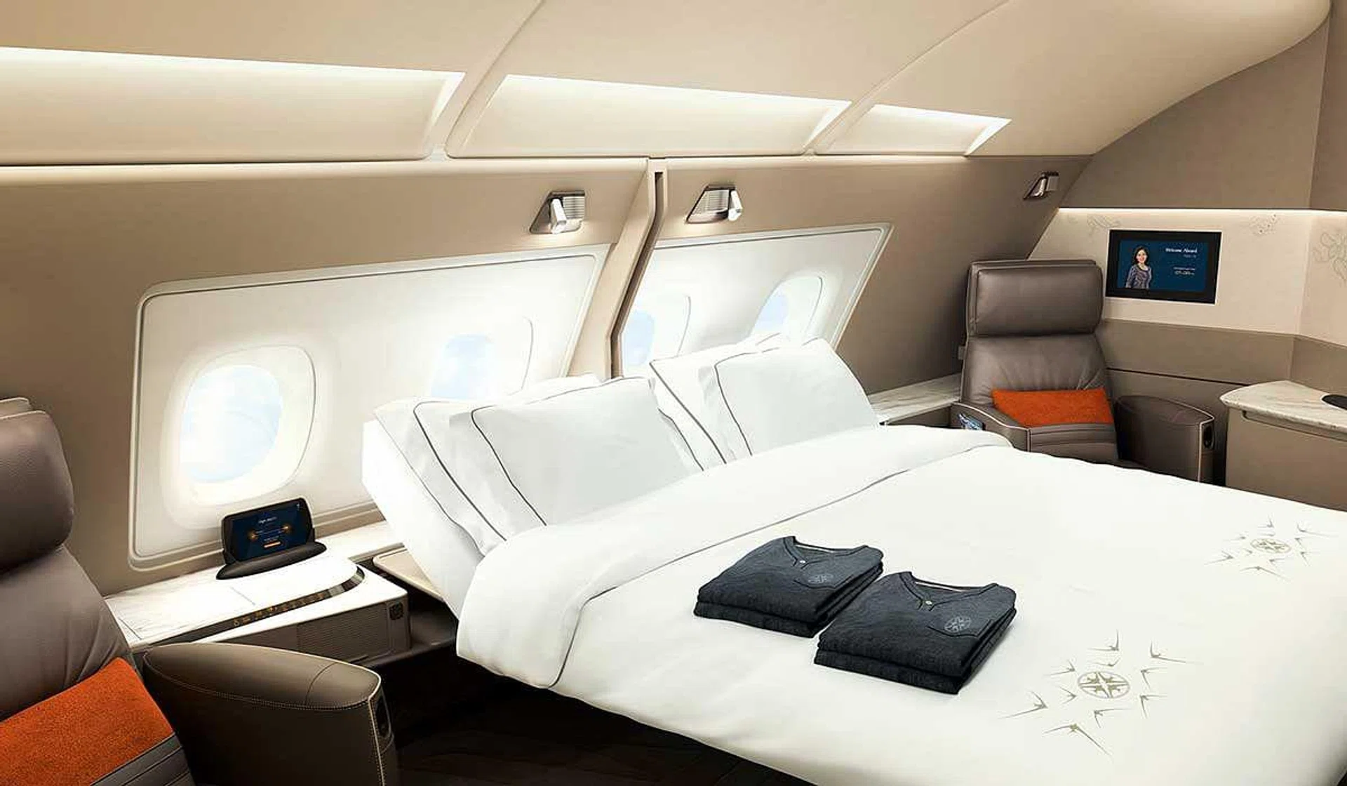 Taking cues from Qatar Airways, the two center-seats have also been configured so that the center divider can be lowered to form double beds for couples and families.
