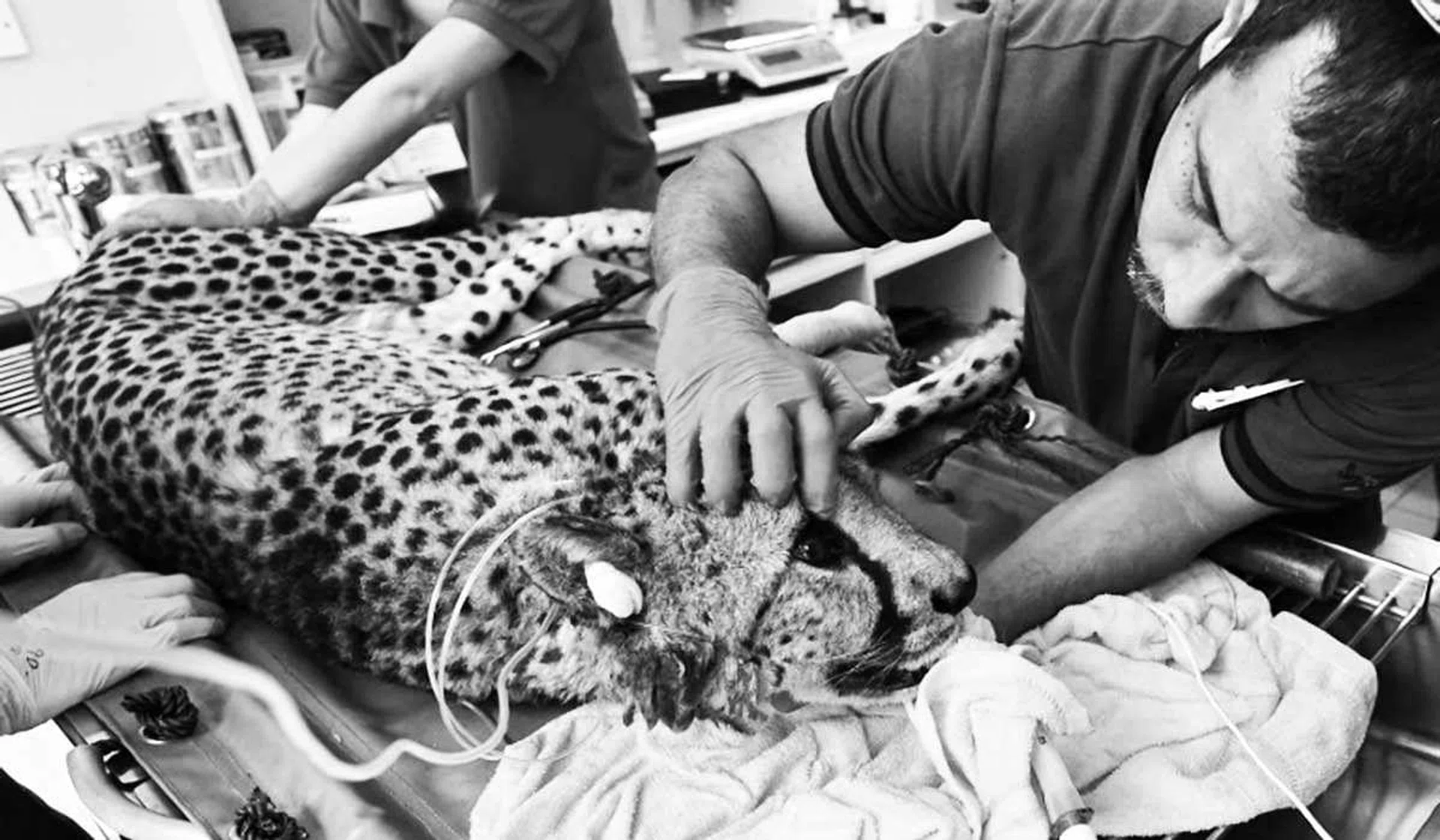 Kima the cheetah lies unconscious on an operating table while blood samples are taken and a monitor beeps in the background, being treated not for the results of a savage attack, but for the ravages of old age.