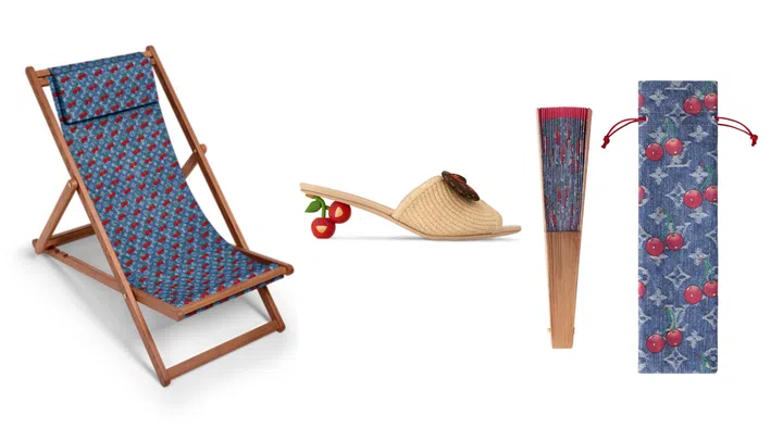 An additional capsule of cherry-embroidered blue denim accessories offers an ultra-collectable dimension, with limited-edition items such as the Pochette Accessoires, the Keepall 45, and season-appropriate gifts like a folding fan and a deck chair. Meanwhile, footwear is given a cheerful refresh, flaunting the gamut from Monogram Cherry ballerinas and platform sandals to crisp white trainers adorned with delicate cherry stitching.