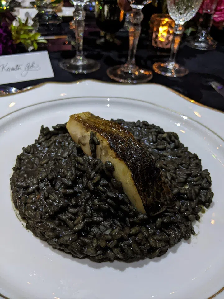 The three-course dinner was whipped up by chefs Chiara Pavan and Francesco Brutto of one-Michelin-starred Venetian restaurant Venissa, which also has a Michelin Green Star for its food sustainability practices. Dishes included a turbot-looking jelly sheet that blankets black chickpeas, green apples, chives-scented sour cream and a dollop of caviar, and a black garlic and almond risotto with poached black fish.