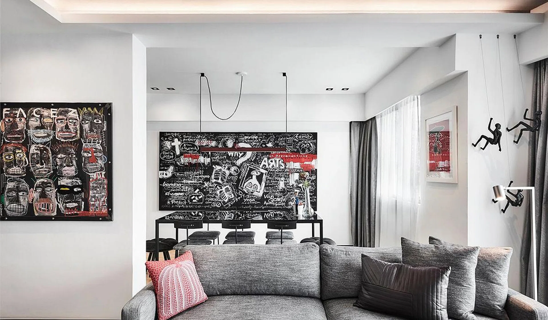 What was originally considered an eyesore ended up serving a creative purpose - a column, smack in the centre of the apartment, has become a backdrop for one of the striking artworks.