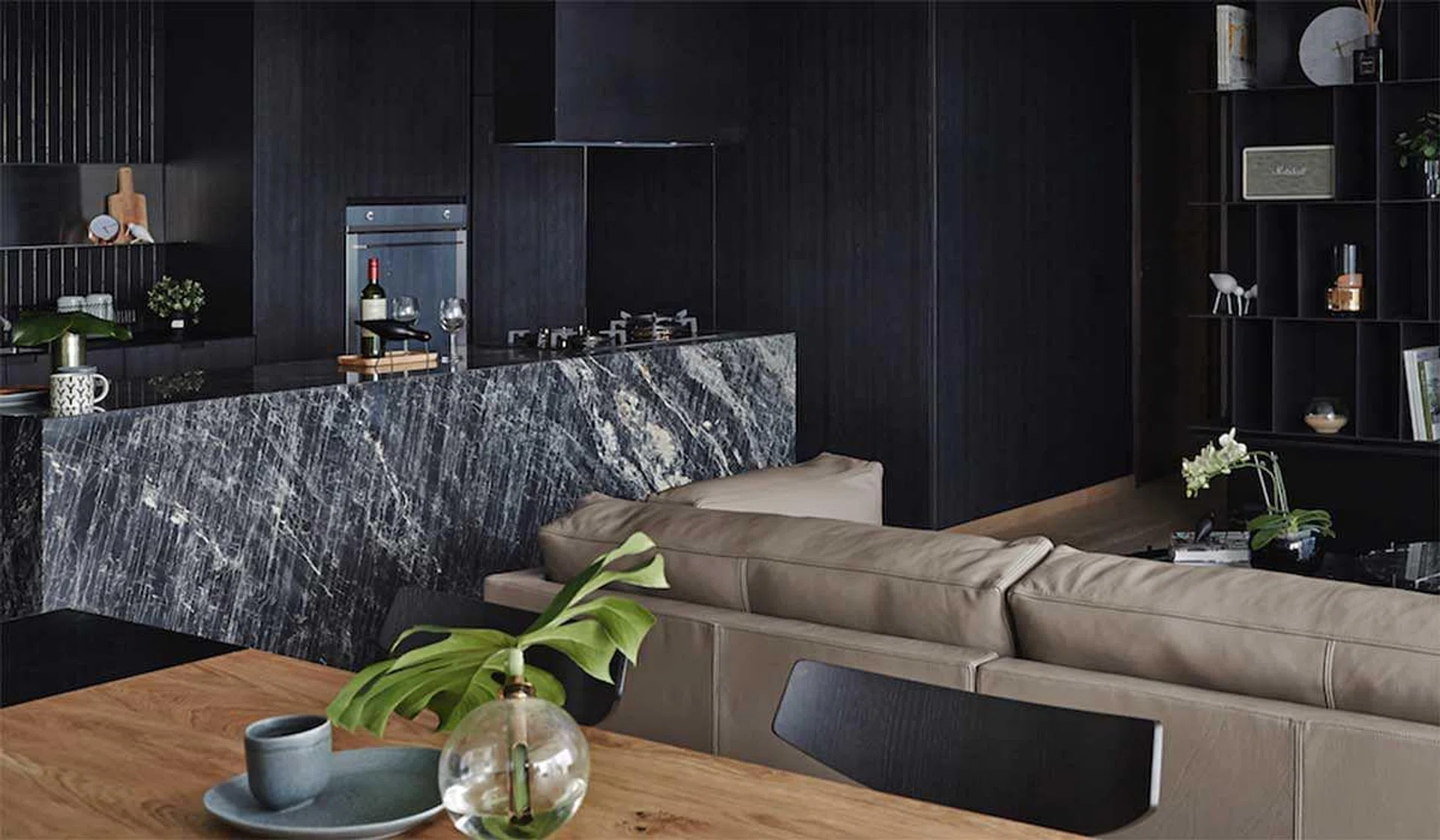 A striking marble island kitchen anchors the living space occupied by a young couple.