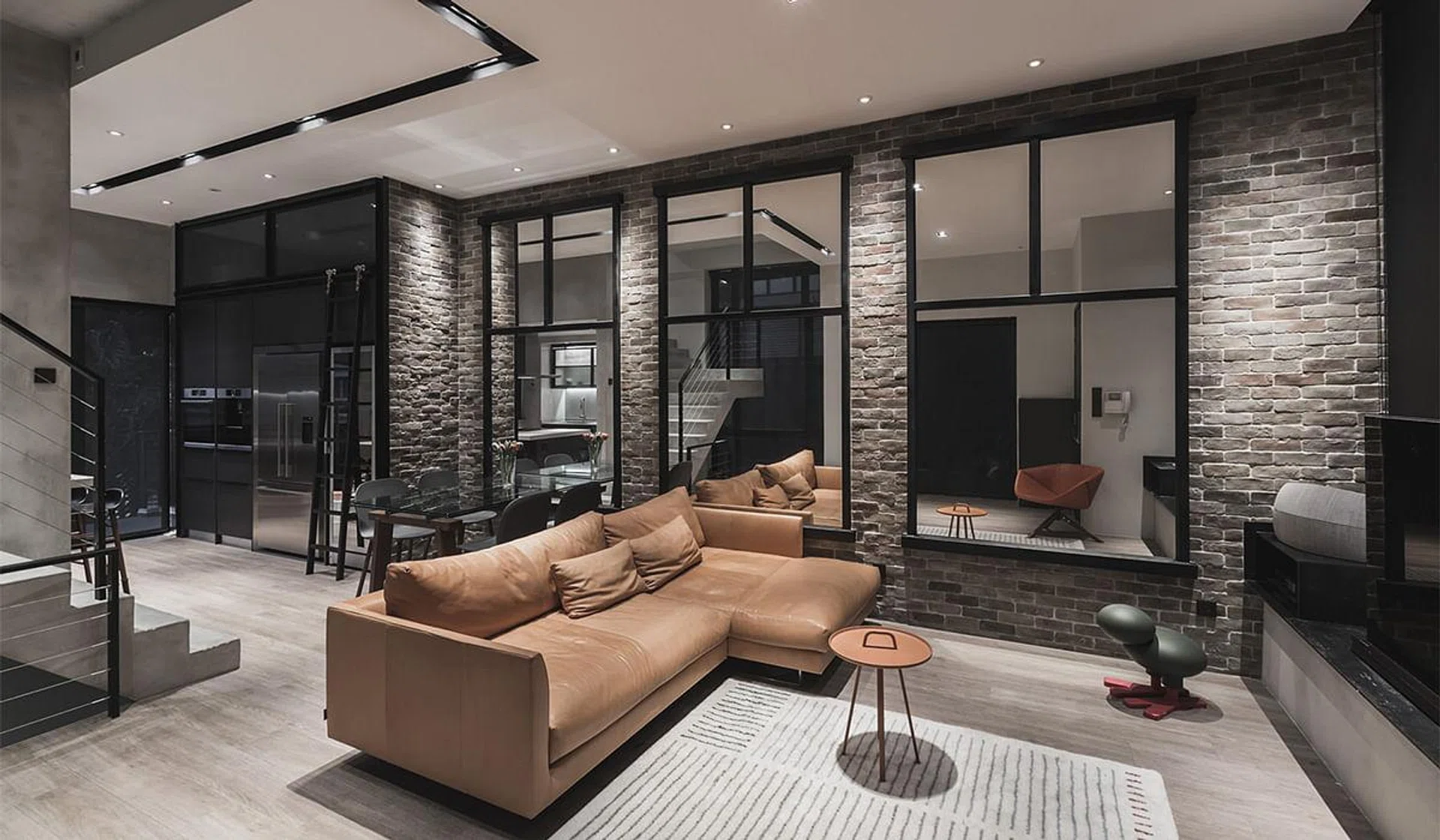 Exposed brick, raw concrete, and a dark colour palette are all contrasted with plenty of natural sunlight.