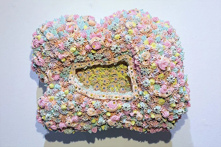The iced gem biscuits of Mazlan’s childhood are embodied in his fantastical 2022 Be Like Flower, Soft As Thorns series of wall sculptures, incorporating silicone, polyurethane, stopping compound, Swarovski crystals, Preciosa crystals, fibreglass, beads, synthetic polymer paint, latex paint, polyvinyl acetate adhesive, and cheesecloth.