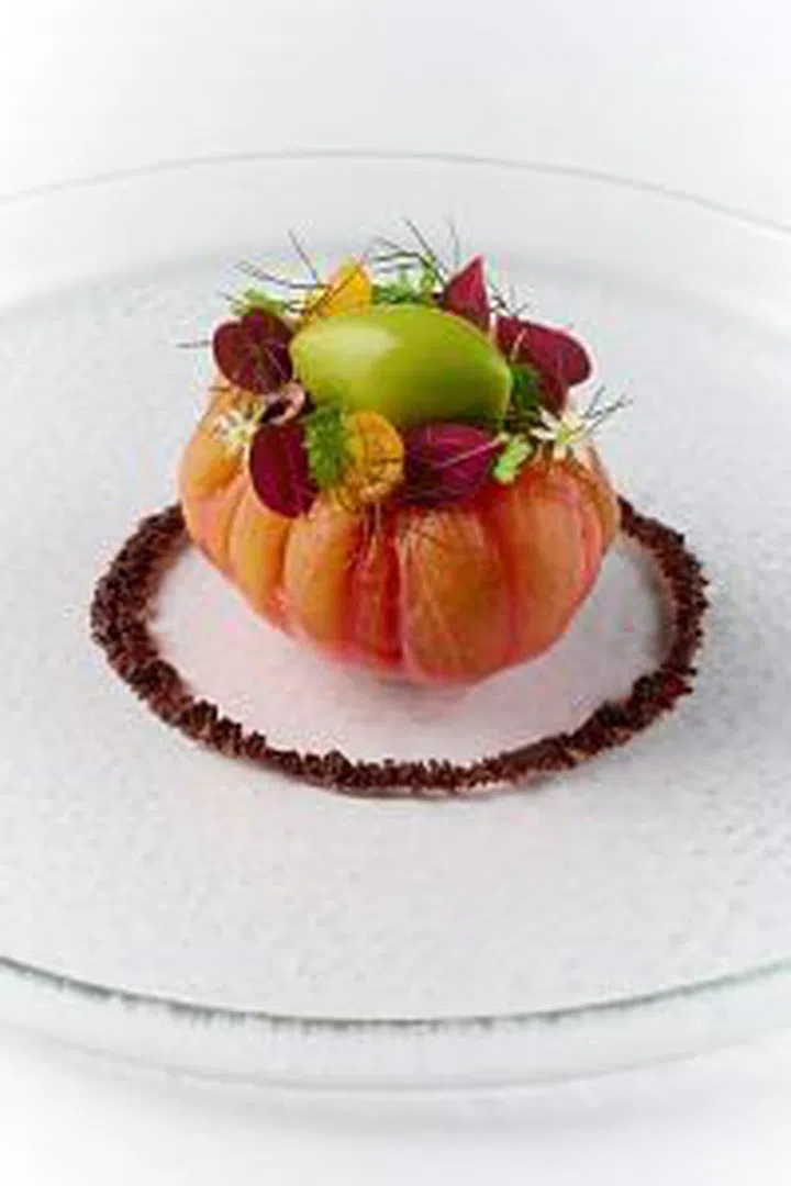 The next course, a Sweet Summer Tomato - a riff on a caprese that packed herb-infused bright flavours within a vine-ripened ox heart tomato. Slow-roasted tomatoes, house made spicy ketchup, dehydrated olives for a salty tang and burrata cheese were accompanied by a bright basil sorbet and an abundance of herbs from the restaurant’s farm.