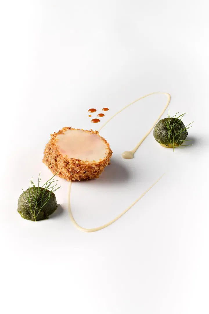This was followed by a velvety reinvention of the British Roast Leek and Potato Soup, served in a receptacle designed by Westaway and a fresh onion baby brioche. It’s a comforting hug in a mug comprising a light but intensely perfumed mushroom stock, truffle trimmings, truffle juice and essence of roasted potato. An airy potato mousse is piped atop the lush soup, and a surprise awaits at the bottom with macadamia nuts.