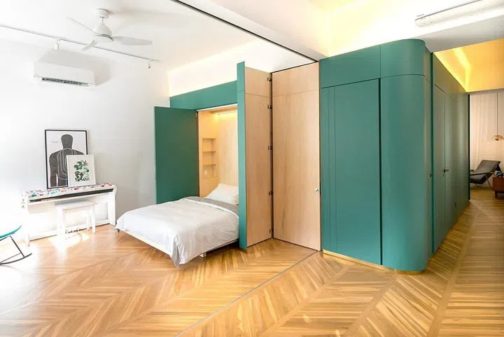 One of the secrets hidden behind the coloured panels is a fold-down bed that can be used when guests stay over.