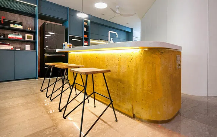The design team custom-created the kitchen island, which features a concrete screed texture to complete the ceiling above the dining table. However, the island was finished in a pop of yellow and enhanced with LED light strip to accentuate the unique texture of the island.
