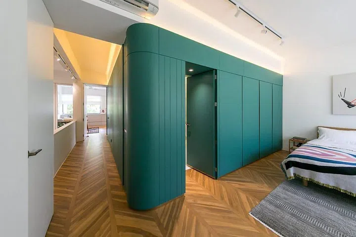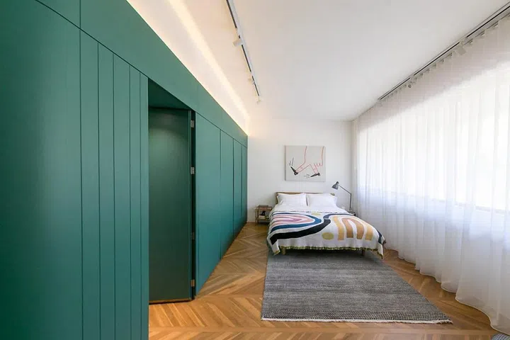 In the bedroom, we see the transition from the teal cabinetry downstairs to a rich jade colour for the walls and shelving.