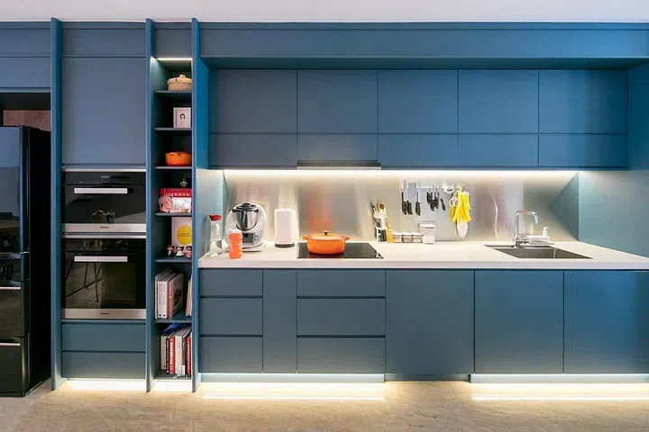 Along the kitchen counter, we see the use of the teal cabinetry creating an interesting juxtaposition against the white countertop and stainless steel backsplash.