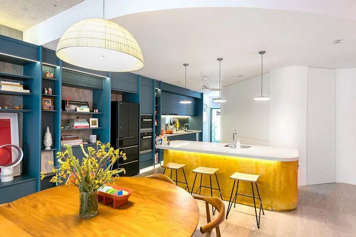 The contrasting look of the teal cabinetry and the yellow kitchen island is an immediate eye-catcher. Notice how the design team also sought to balance out the bright colours with plenty of white walls.